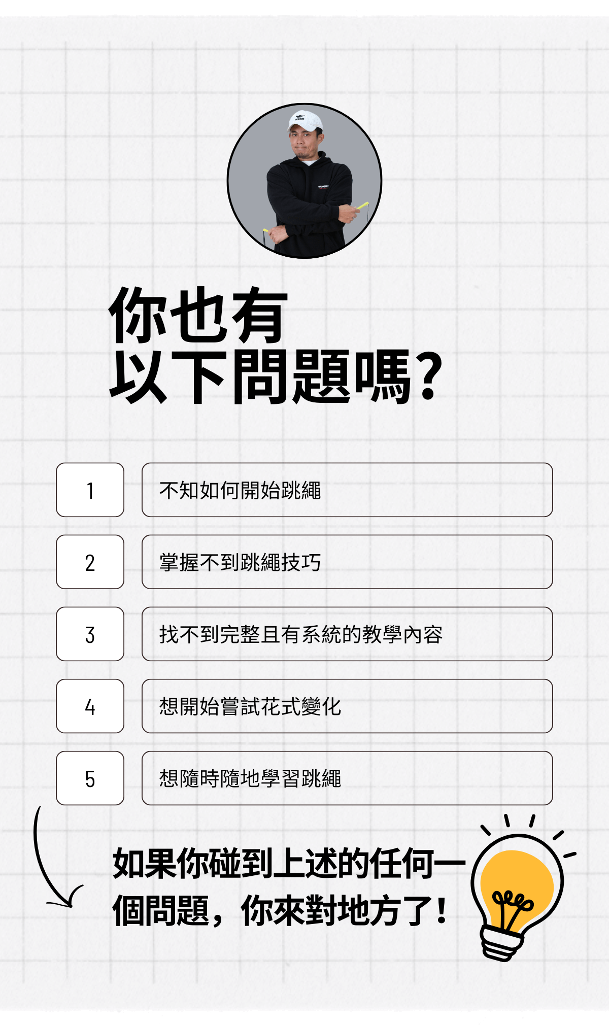 你想跳繩但不知道如何開始嗎?這套課程將教會你跳繩前必須了解的知識、跳繩基本動作、與花式必學基本動作,幫助你打下一個好的跳繩基礎,讓你有能力可以往更進階的跳繩之路邁進!