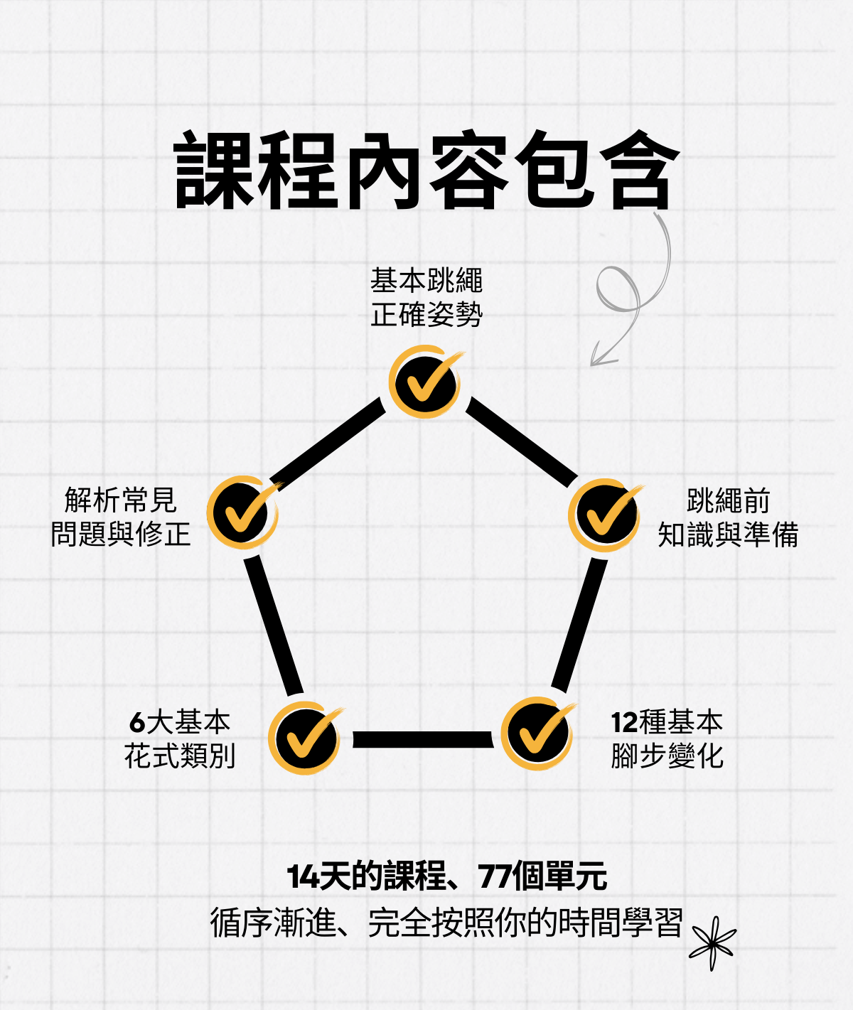 不管你是對跳繩有興趣而想要開始學習的新手,又或是你已經自學一段時間,但還是摸不著頭緒的初學者,這套課程都適合你。此課程為跳繩老爸精心規劃的跳繩入門課程,內容涵蓋跳繩前的準備與知識、基本腳步、基本花式動作。每天的主題透過詳細的分解步驟與觀念講述,讓花式跳繩不再遙不可及。